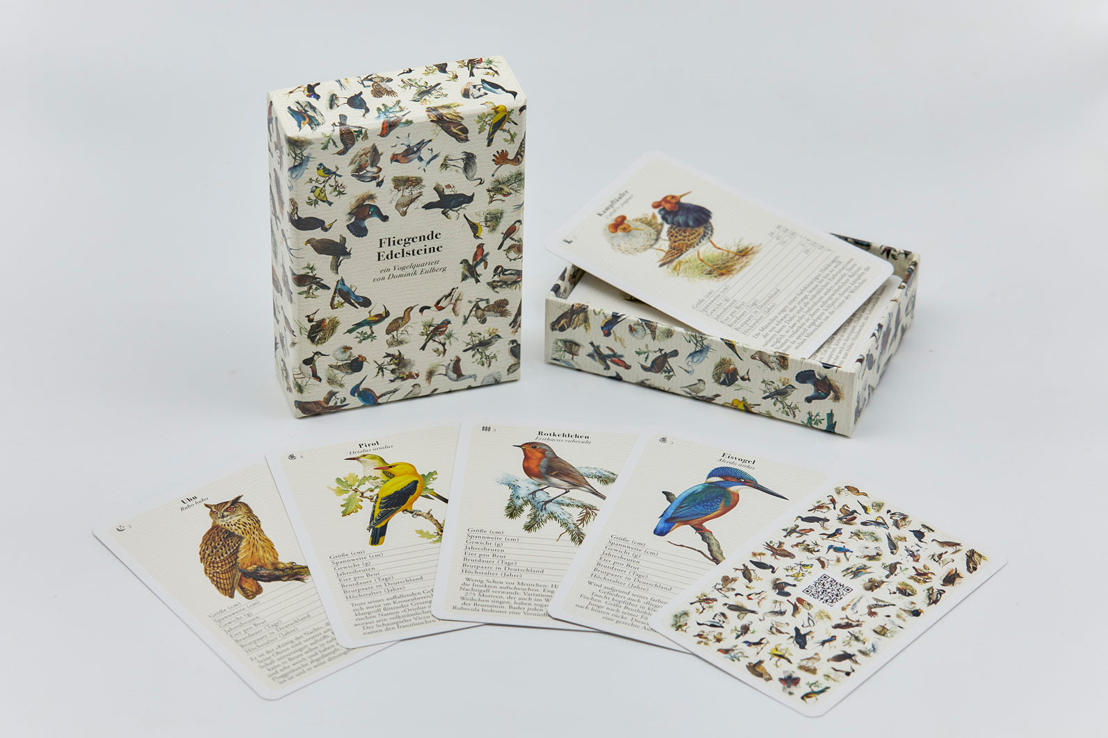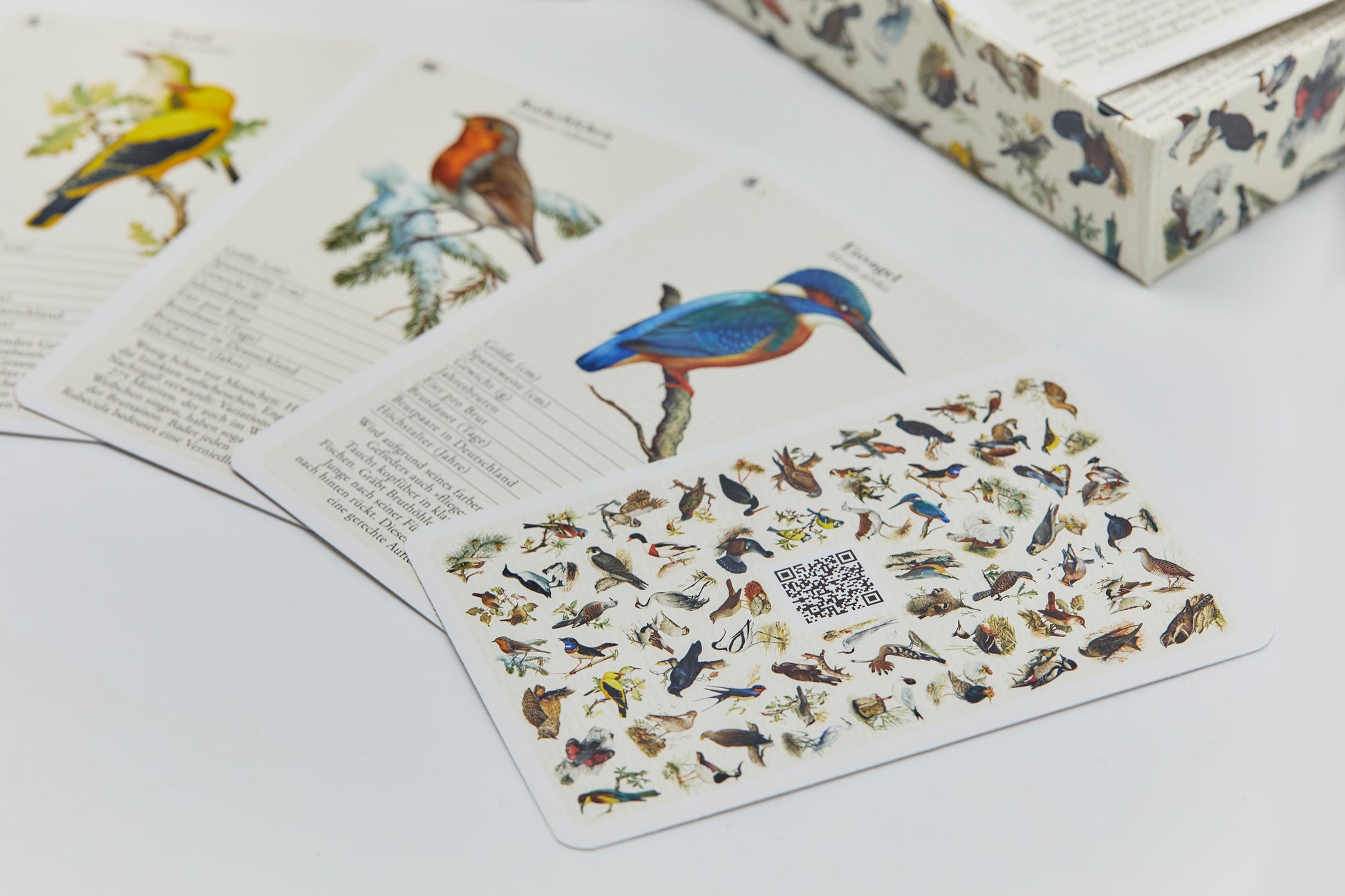- 56 Spielkarten heimischer Vogelarten, die einen Querschnitt durch alle Vogelfamilien darstellen