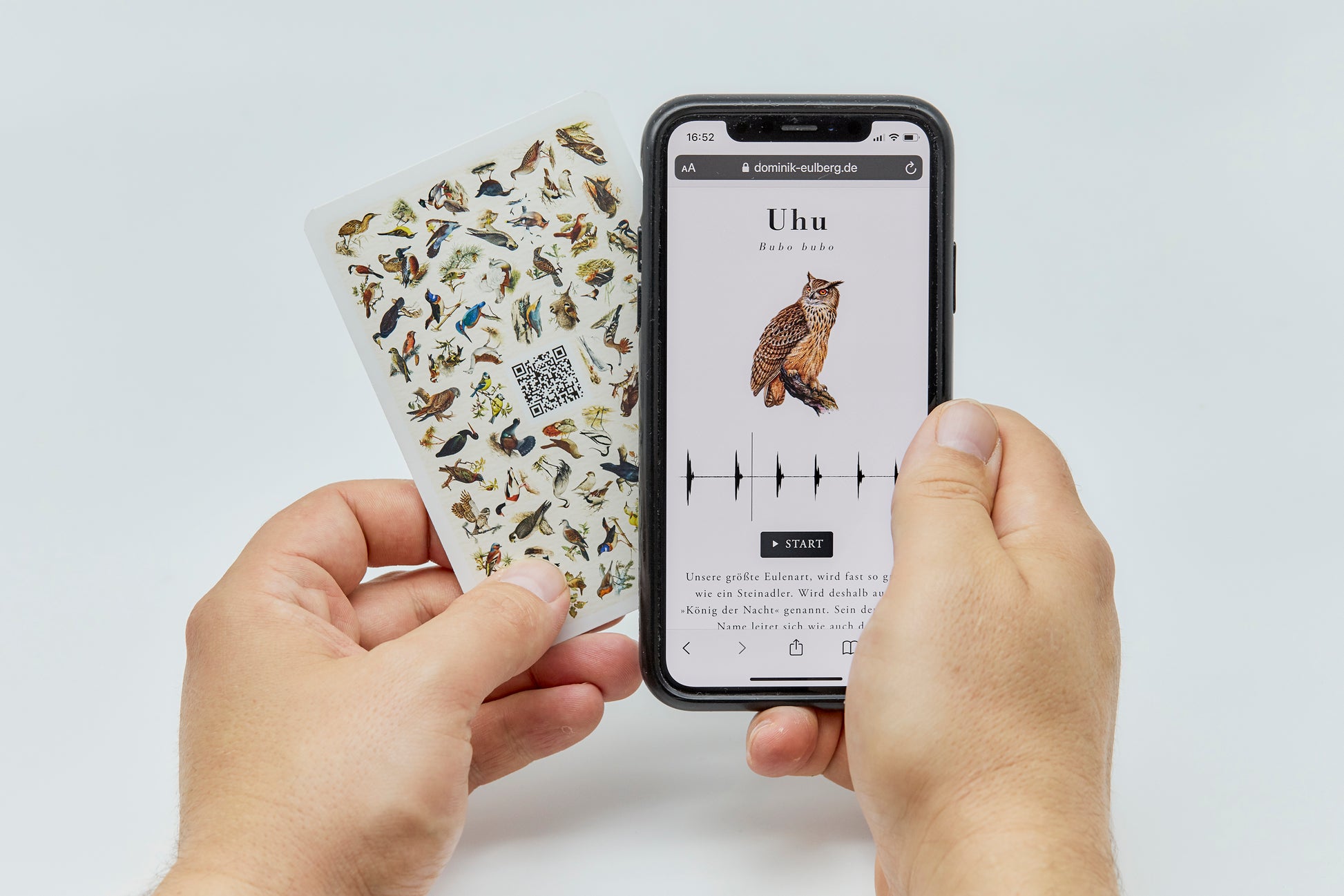 - Durch Scannen von QR - Codes auf der Rückseite der Karten können die Stimmen der Vögel zum Klingen gebracht werden, indem via Autoplay die Gesänge, Rufe oder Laute der einzelnen Arten auf einer eigens programmierten Webpage abgespielt werden.